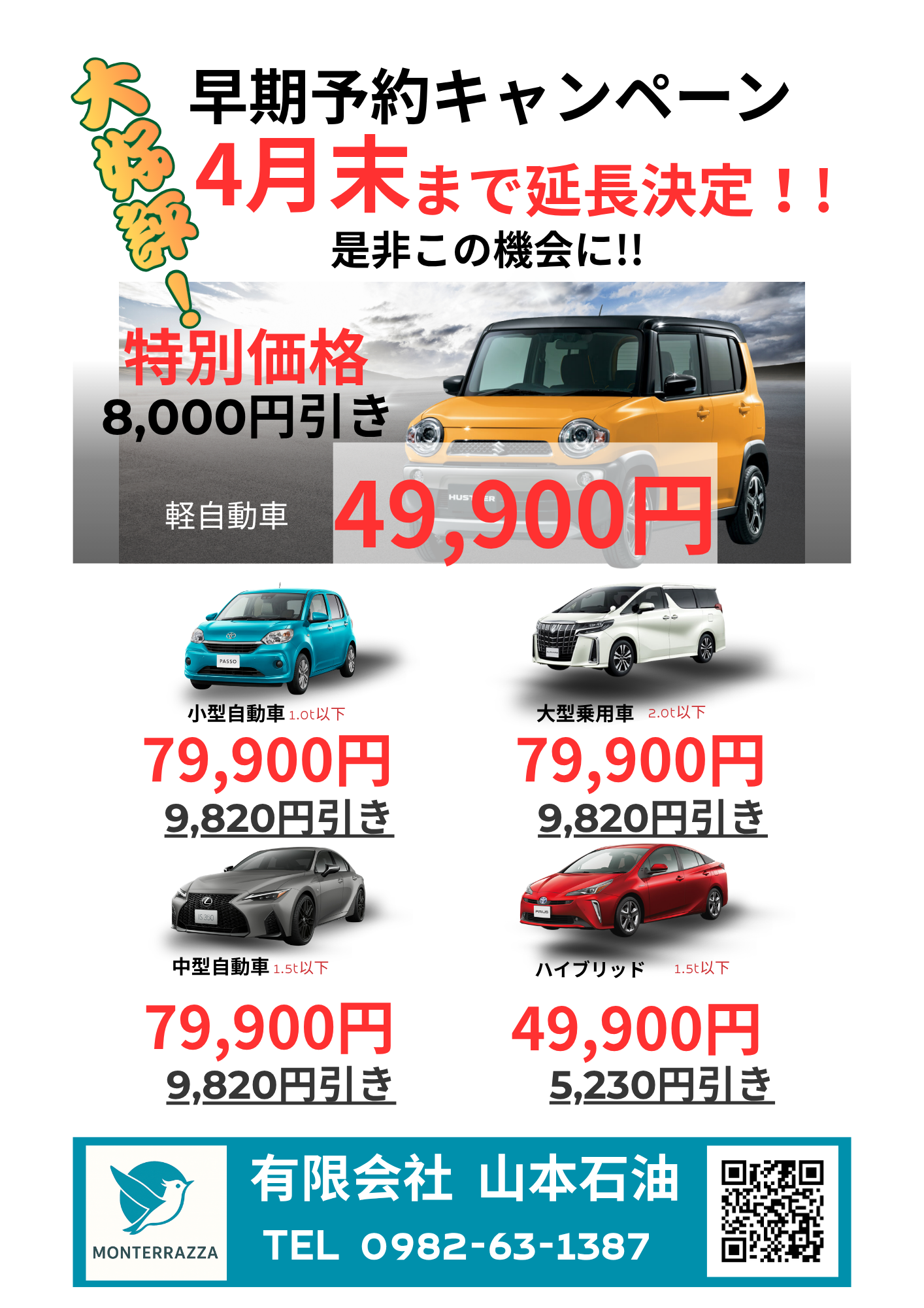 平素より山本石油(MONTERRAZZA)をご利用頂きありがとうございます。2月・3月に行いました車検キャンペーン、多くの方からご利用頂きました。感謝申し上げます。好評につき、4月末まで延長することになりました。ぜひこの機会にご利用お待ちしております。